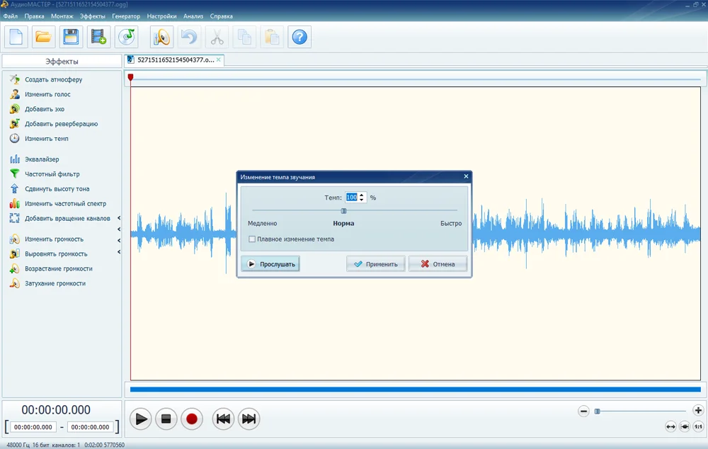 - Кликните «Изменить темп». Отрегулируйте значение ползунком или в процентном соотношении. Можно поставить галочку «Плавное изменение темпа», чтобы на дорожке не было рывков. Далее «Применить».