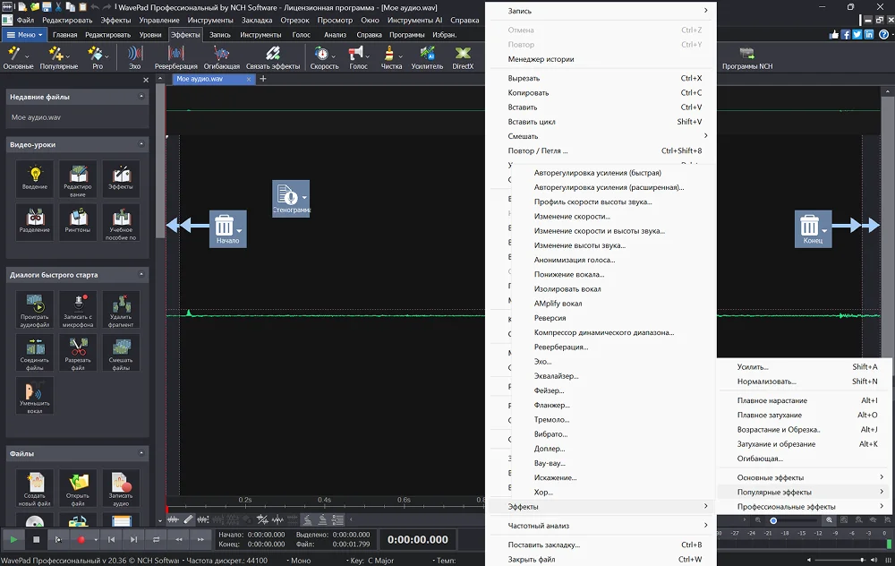 - Щелкните правой кнопкой мыши по треку, далее выберите «Эффекты» → «Популярные эффекты» → «Изменение скорости и высоты звука».