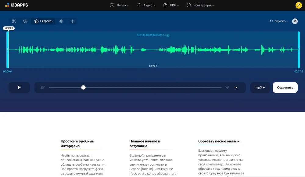 Простой сервис для выделения фрагментов из музыкальных треков с возможностью плавного начала и завершения. Пользователю не требуется ставить ПО: все происходит в браузере, включая загрузку, обрезку и сохранение. Поддерживаются сотни аудиоформатов, включая редкие.