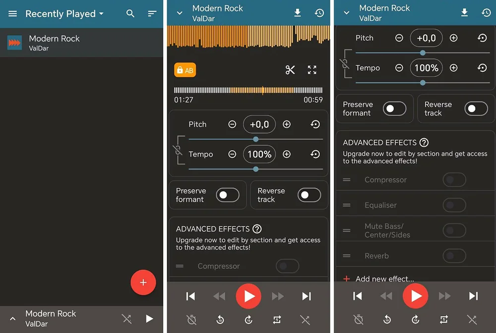 Этот вариант подойдет, если вы ищете решение, чтобы замедлить аудио без искажений. Продукт предлагает возможности управления тоном песни. Каждый из параметров можно менять отдельно. Музыкантам также пригодятся реверс (обратное воспроизведение), проигрывание всей песни или отдельных отрывков на бесконечном повторе. Имеются опции для редактирования ключа и ритма, эквалайзер с пресетами и эффекты.